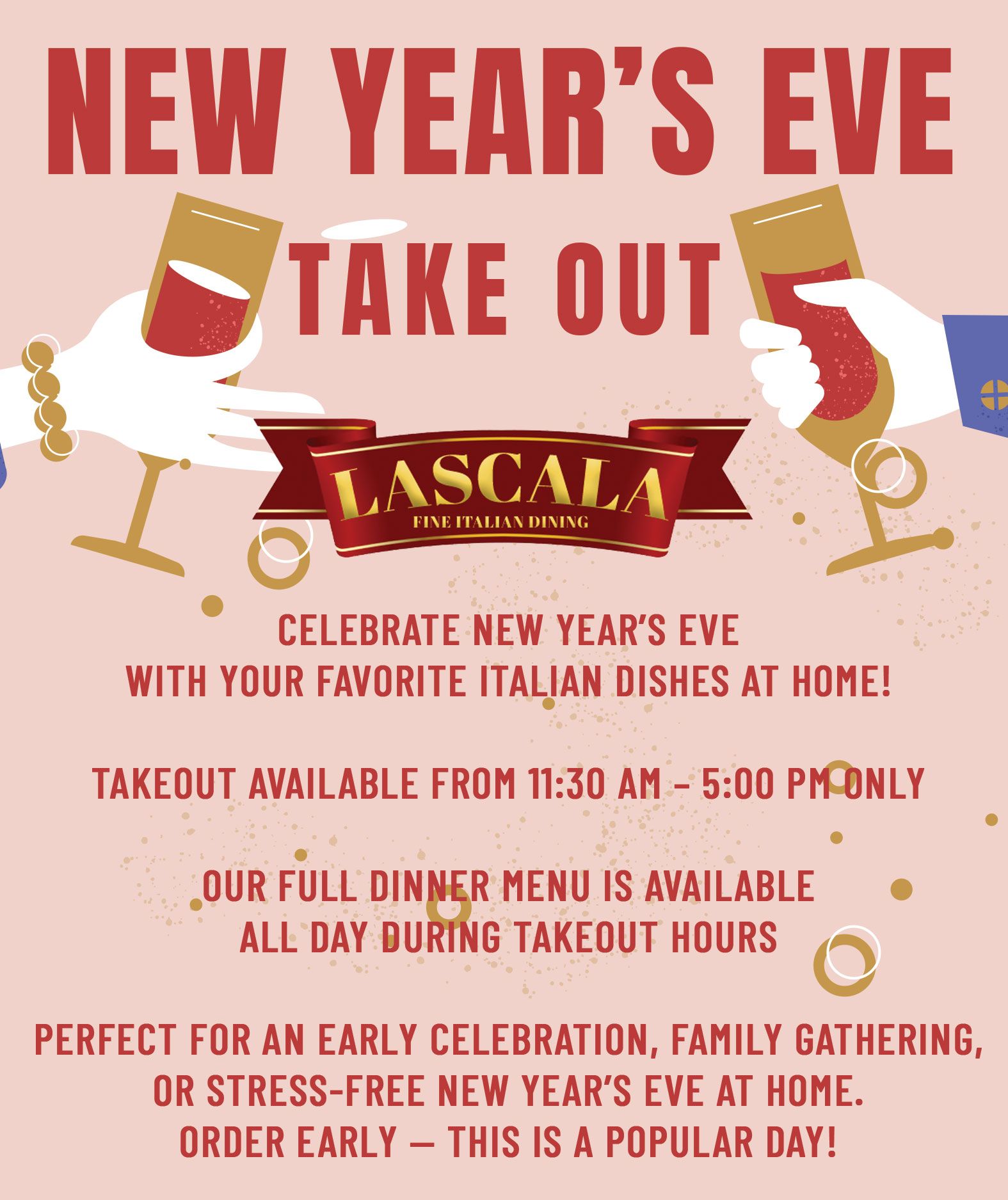 We would like to thank our many regular customers for making LaScala the success we have become for over four generations. Your comments have helped us to maintain the quality of food and service that is typical of European dining. It is our endeavor to purchase as many imported products as possible in order to keep our cuisine authentic. To our first time diners, we welcome you and hope you will enjoy our tradition that has maintained high standards for excellence for the past four generations.